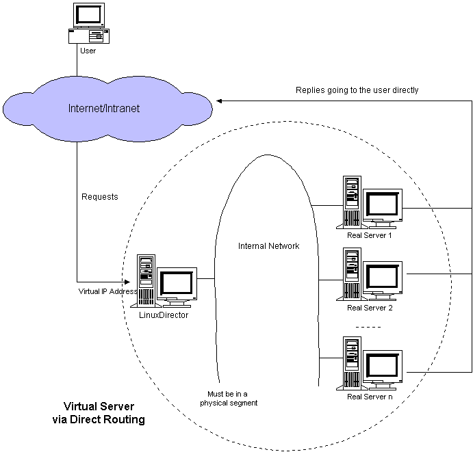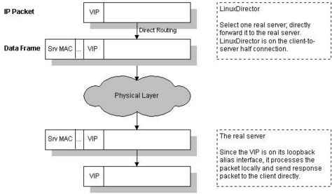 继续上一篇文章是直接写的TUN模式,现在简单的试试DR模式,其实    DR模式的配置和TUN模式的配置基本类似的。主要就是把keepalived里面的TUN改成DR就行,然后RS上绑定VIP的脚本稍微修改一下,直接把VIP绑定在loopback地址上。DR模式的原理示意图如下